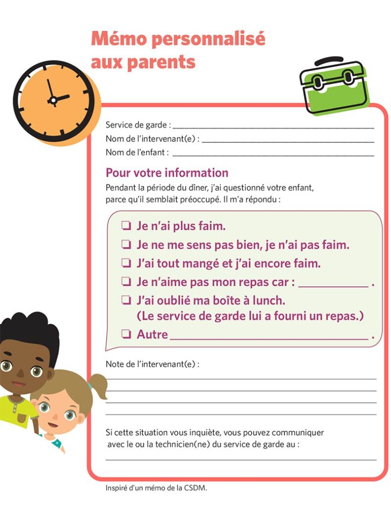 Tiré du guide d’accompagnement, voici un mémo à glisser au besoin dans la boîte à lunch d’un élève, avec des cases à cocher. Une autre façon d’informer les parents sur l’importance de favoriser l’autonomie de son enfant par l’écoute de ses signaux de faim et de satiété et par sa participation à la préparation de sa boîte à lunch.
